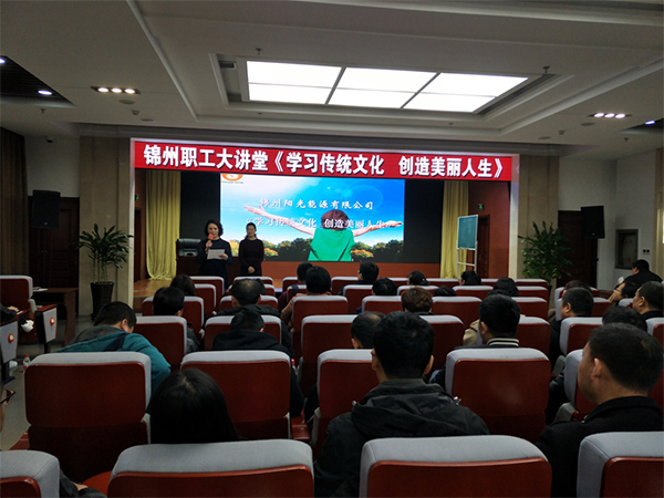 為弘揚(yáng)優(yōu)秀傳統(tǒng)文化,傳承國(guó)學(xué)先賢思想,提升干部職工思想道德境界,3月16日我司工會(huì)在錦州市職工會(huì)館四樓組織開(kāi)展《學(xué)習(xí)傳統(tǒng)文化、創(chuàng)造美麗人生》培訓(xùn)講座,集團(tuán)職能部門(mén)管理人員及各專業(yè)公司主管及以上人員、光伏行業(yè)各企業(yè)職工共計(jì)160人參加。