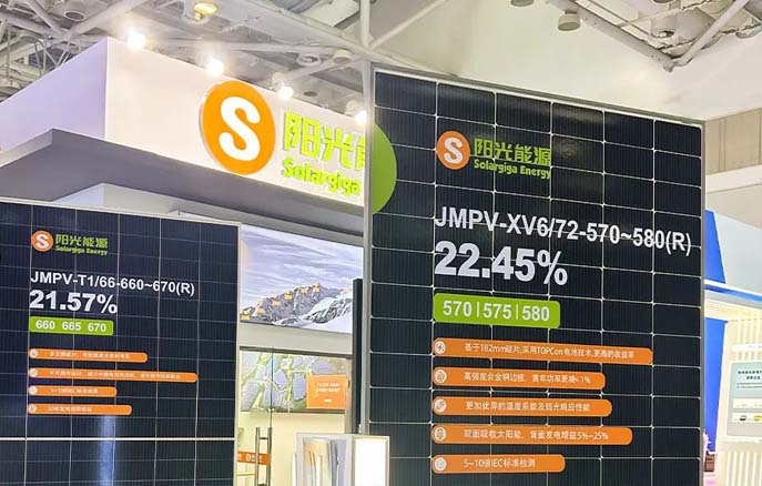 本屆展會,陽光能源重點(diǎn)展示了Giga-N系列兩款高效產(chǎn)品,分別是182 72版型雙玻和182 54版型單玻全黑組件,采用前沿的N型TOPCon技術(shù),具備高效率、高發(fā)電量、高品質(zhì)等多重優(yōu)勢,能夠?yàn)榭蛻魩砀叩膬r(jià)值。其中,182 54版型單玻全黑組件是陽光能源面向全球分布式市場打造的高端產(chǎn)品之一,外觀精美,量產(chǎn)效率可達(dá)21.76%,被廣泛應(yīng)用于建筑屋頂?shù)葢?yīng)用場景。