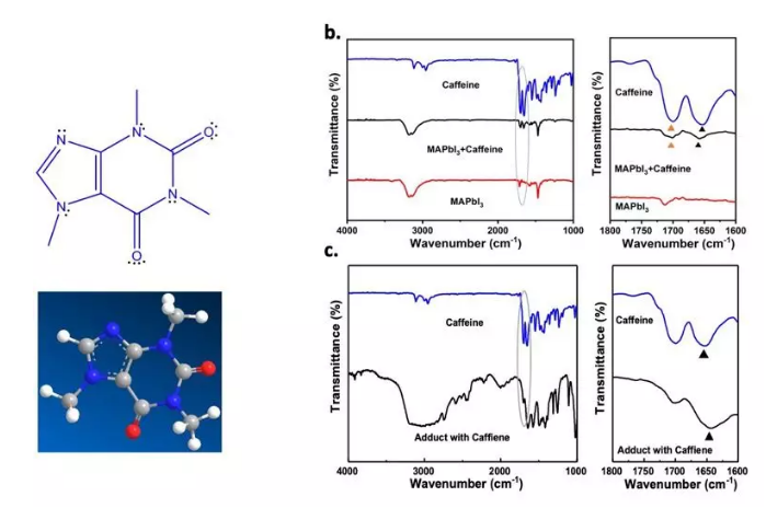 楊陽研究小組用加熱的方法將咖啡因添加到40個(gè)太陽能電池的鈣鈦礦層中,并使用紅外吸收光譜來確定咖啡因是否成功地與鈣鈦礦結(jié)合了。他們發(fā)現(xiàn)了咖啡因在與鈣鈦礦結(jié)合后,咖啡因中的羰基的特征峰發(fā)生了移動(dòng),這意味著咖啡因已經(jīng)成功與鈣鈦礦結(jié)合了。