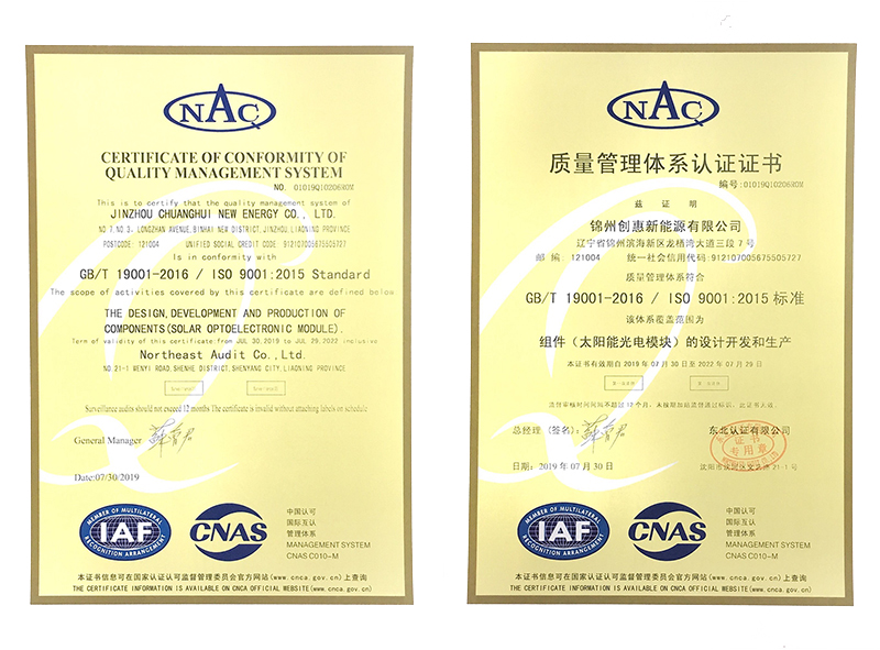 2019年7月30日,錦州陽(yáng)光能源有限公司全資子公司錦州創(chuàng)惠新能源有限公司喜獲品質(zhì)體系認(rèn)證證書