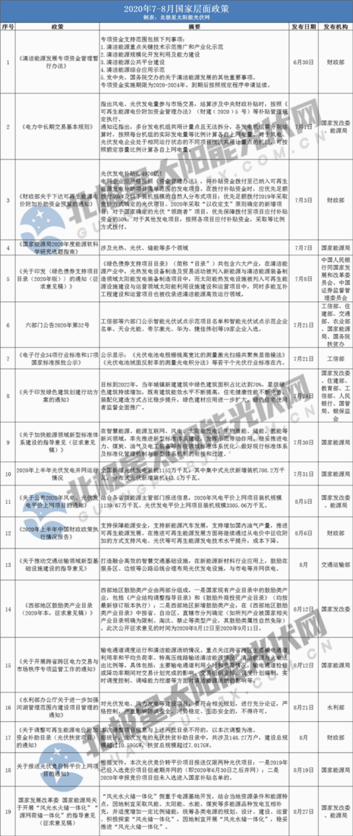 國(guó)家層面,7、8月份共發(fā)佈19項(xiàng)光伏政策,涉及可再生能源電價(jià)補(bǔ)貼、光伏競(jìng)/平價(jià)政策、電力市場(chǎng)交易、BIPV、風(fēng)光儲(chǔ)一體化專(zhuān)案等多個(gè)方面。